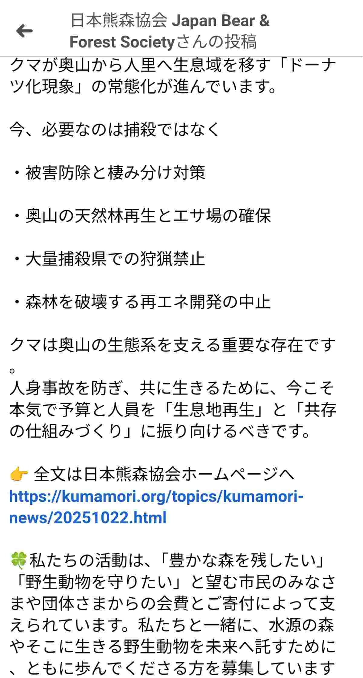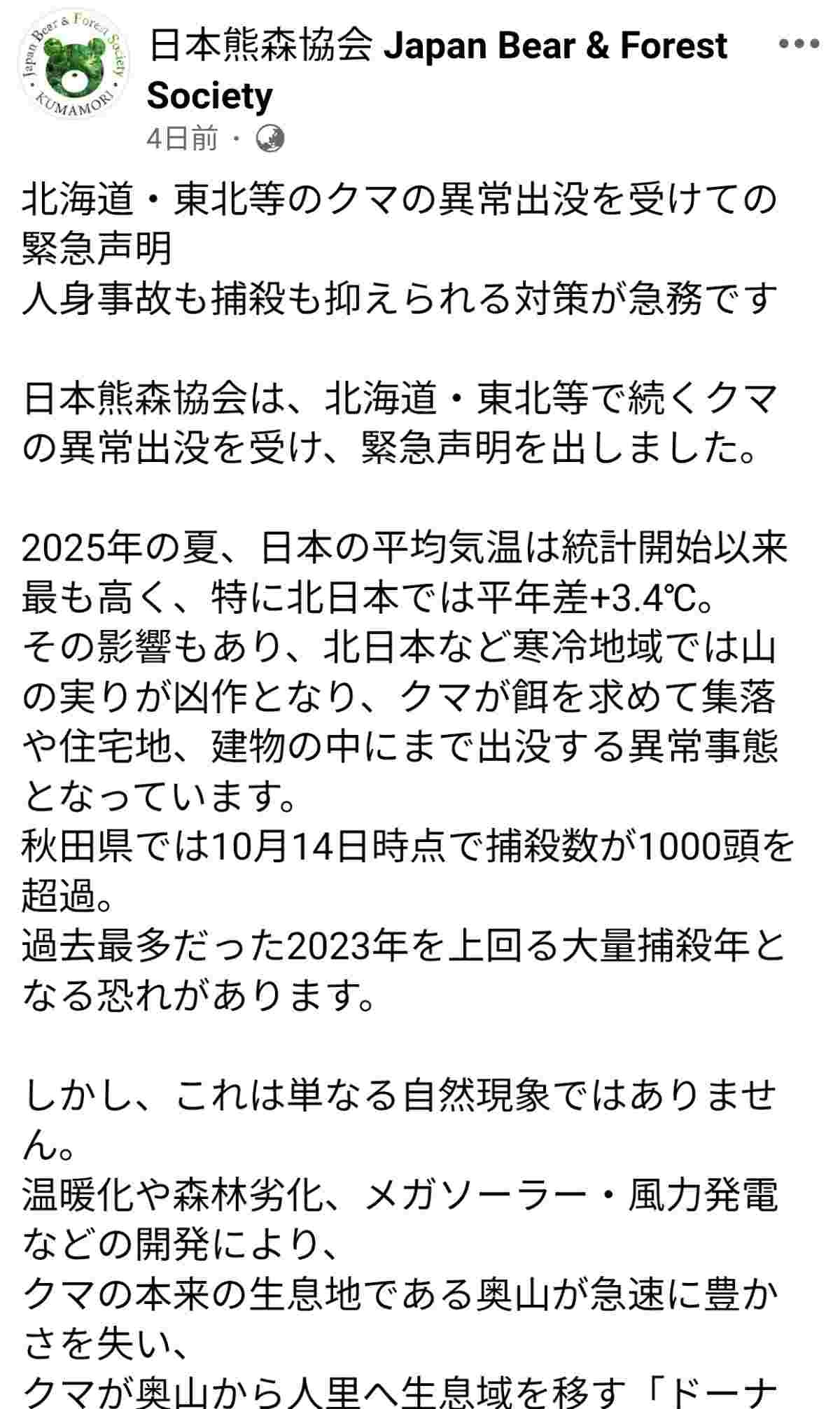 日本熊森協会が緊急声明「クマを補56するな!メガソーラーが悪い!!」