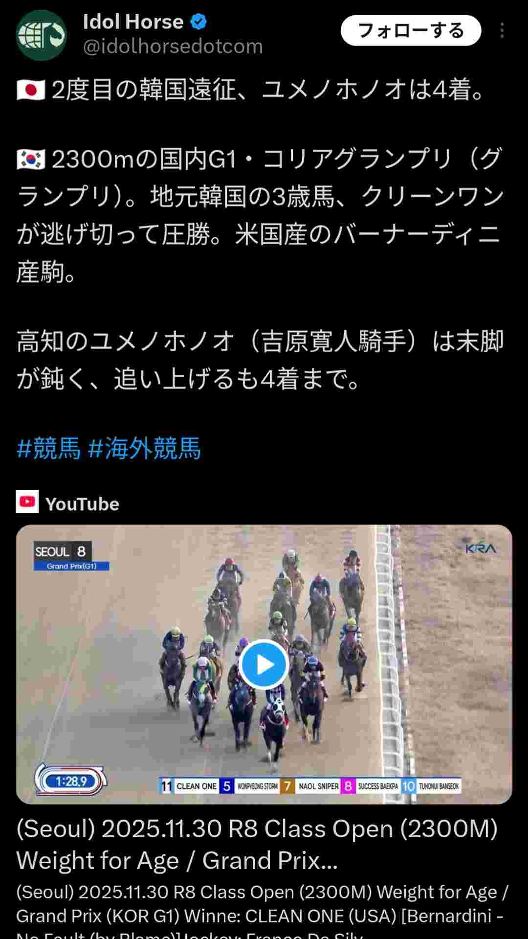 🇯🇵 2度目の韓国遠征、ユメノホノオは4着。