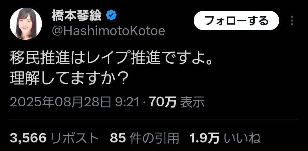 普通の日本人女性「移民推進はレイプ推進ですよ。理解してますか?」