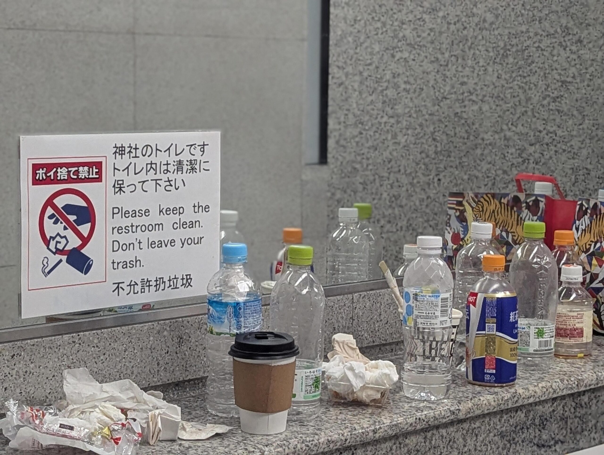 今月27日、「#伏見稲荷」のハッシュタグをつけて投稿された写真には、トイレの洗面台の前にペットボトルやティッシュ、紙袋など、大量のゴミが放置された様子が収められている。洗面台の鏡には「神社のトイレです」「トイレ内は清潔に保って下さい」という日本語、英語、中国語の注意書きの他、ポイ捨て禁止のピクトグラムが記されており、その前に放置されたゴミからは行為の悪質さがうかがえる。