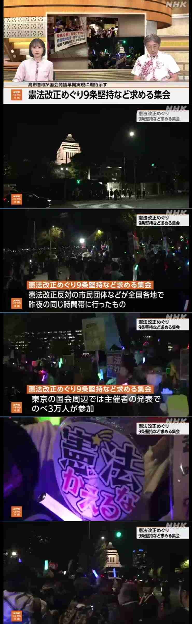 これは、憲法改正に反対する市民団体などが全国各地で8日夜の同じ時間帯に行ったもので、東京の国会周辺では、主催者の発表でのべ3万人が参加しました。