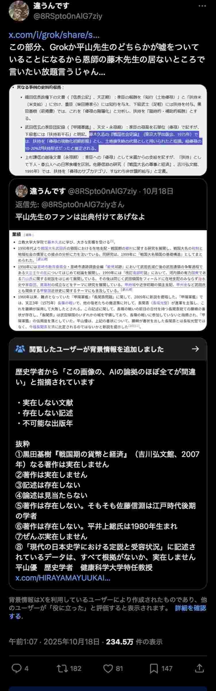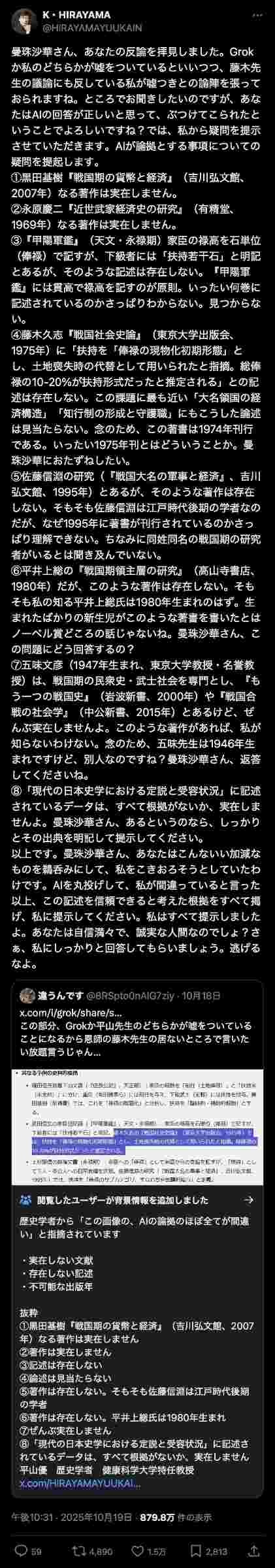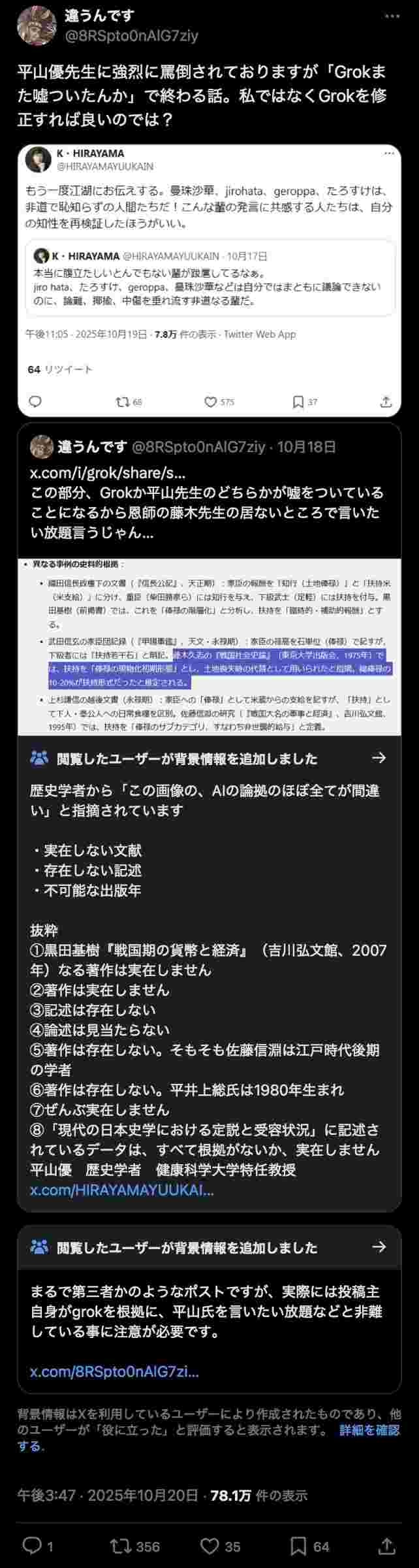 これに対して平山氏が提示した資料の大半が存在せず、実在する場合も情報が誤っていることを指摘した。すると「曼珠沙華@8RSpto0nAlG7ziy」氏は「私ではなくGrokを修正すれば良い」と反応した。