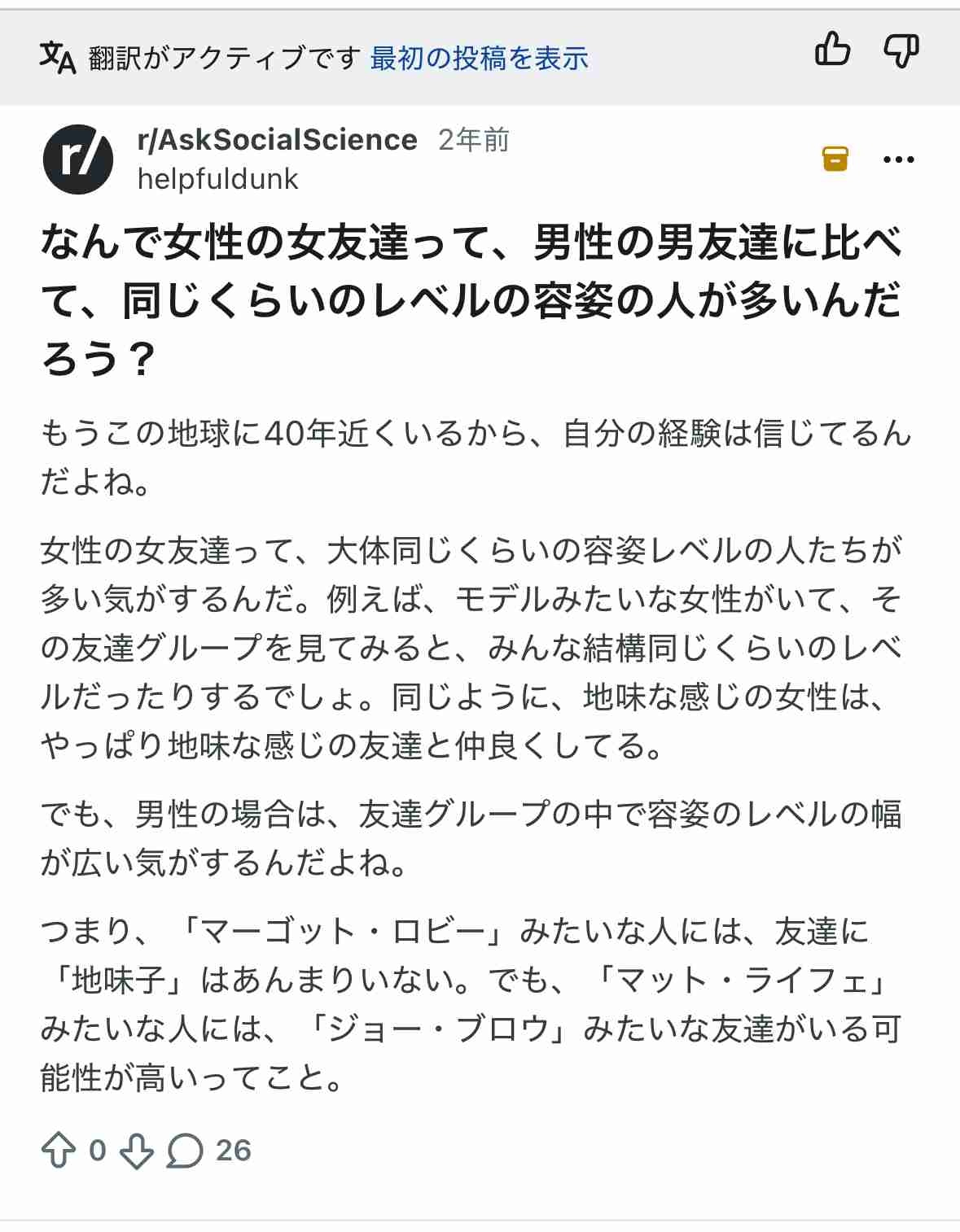 女性の女友達って、大体同じくらいの容姿レベルの人たちが多い気がするんだ。例えば、モデルみたいな女性がいて、その友達グループを見てみると、みんな結構同じくらいのレベルだったりするでしょ。同じように、地味な感じの女性は、やっぱり地味な感じの友達と仲良くしてる。