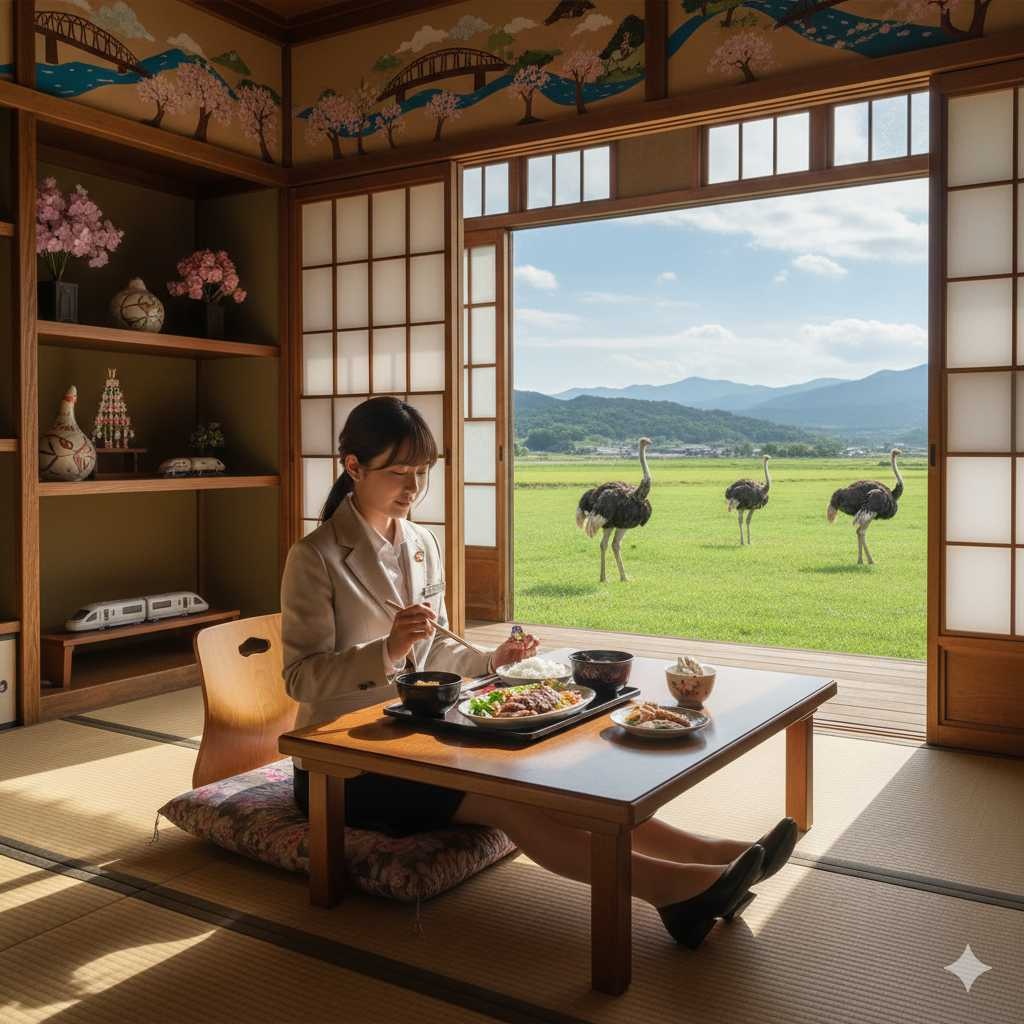 日本では珍しくダチョウを飼育する牧場がある。ダチョウ肉の焼肉定食などを食べられる