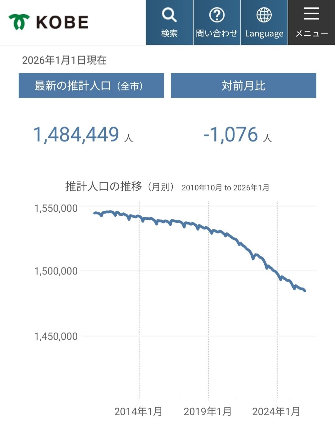 神戸市の人口は、阪神・淡路大震災後の回復期を経て、2011年頃(約154.5万人)をピークに減少傾向に転じ、2023年10月には22年ぶりに150万人を下回りました(約149.9万人)。これは主に少子高齢化による自然減と、ニュータウン(北区・西区など)の人口減少が主な要因で、近年は転出超過にもなっていますが、市は人口減少時代に対応した街づくりを進めています。