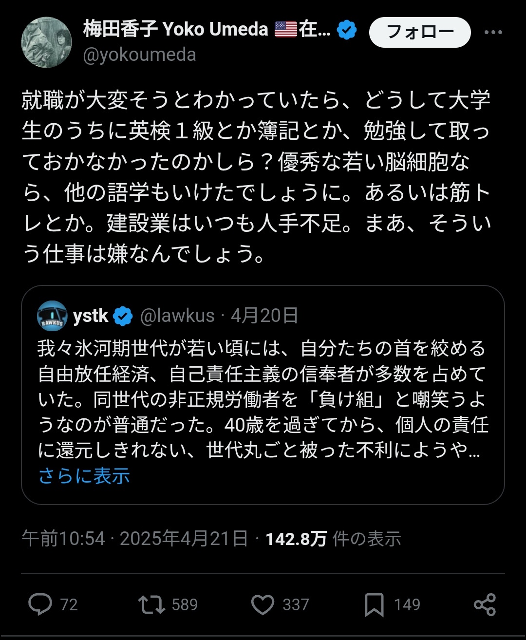 米移住30年超のバブル世代識者「就職氷河期で就職大変だとわかってたなら英検とか簿記とか勉強して取っておけばよかっただけでは?」