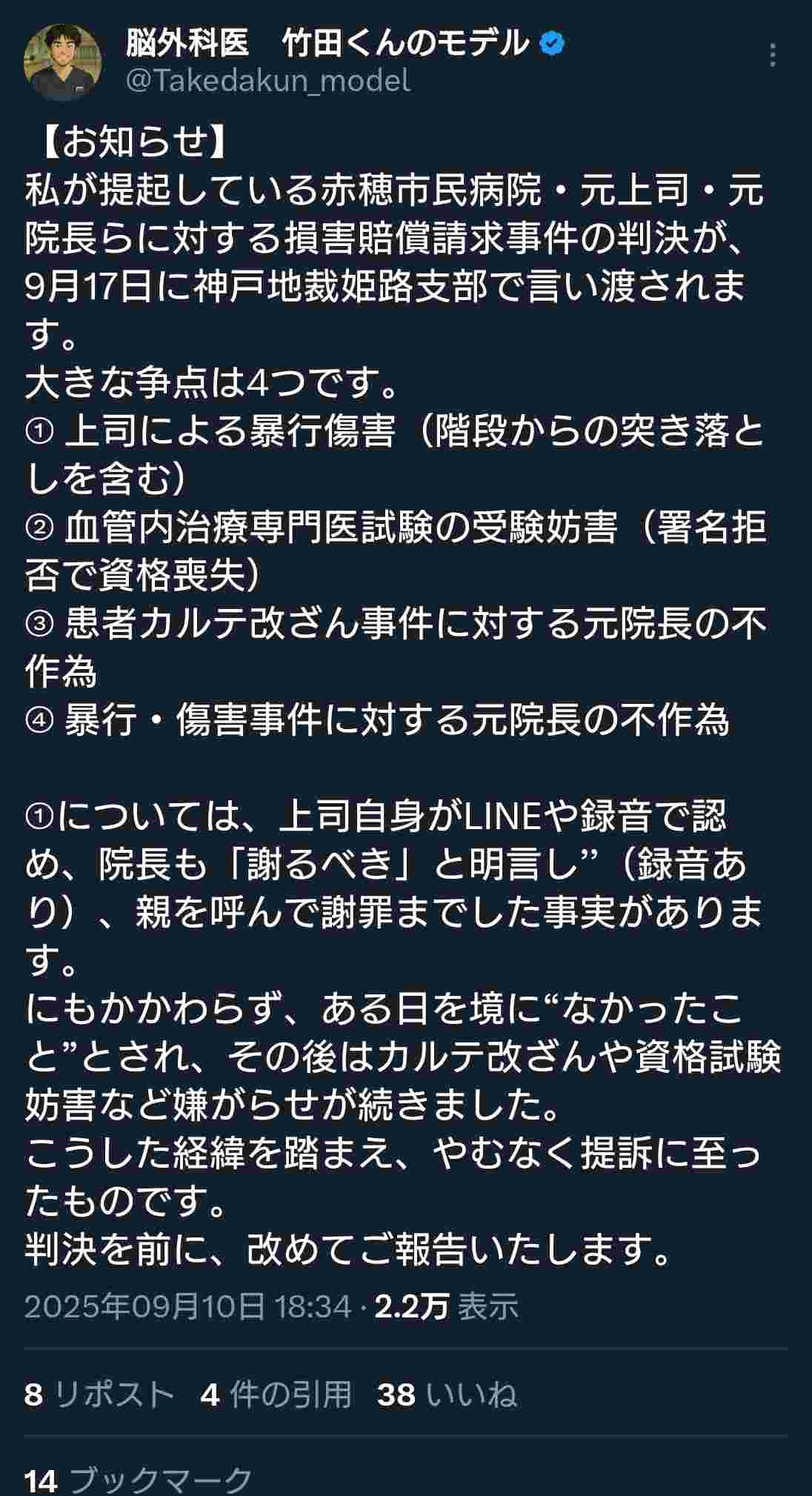 私が提起している赤穂市民病院・元上司・元院長らに対する損害賠償請求事件の判決が、9月17日に神戸地裁姫路支部で言い渡されます。