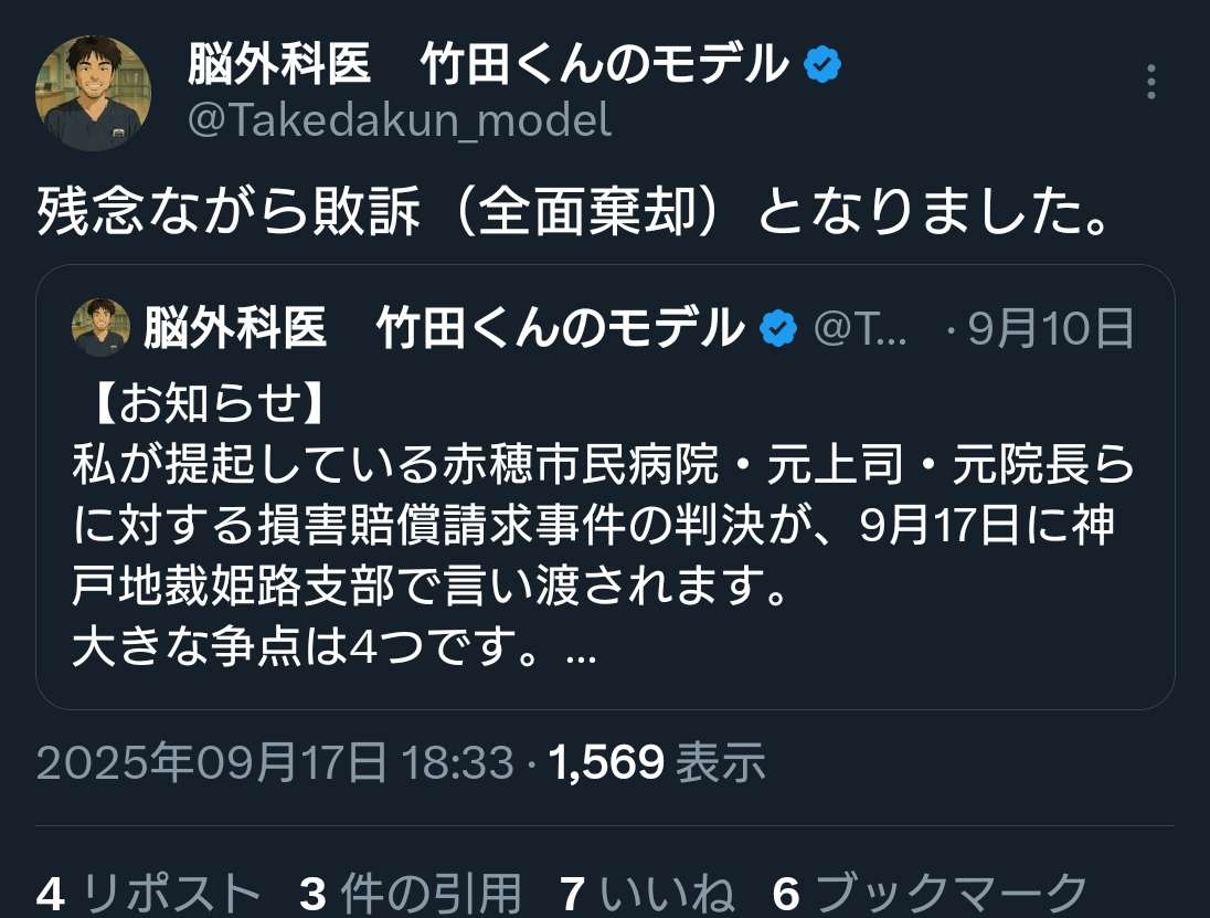 残念ながら敗訴(全面棄却)となりました。 「脳外科医竹田くん」は名誉毀損?医療事故元にしたウェブ漫画で訴訟…作者側「告発公益目的」医師側「事実に反する」【読売新聞】 実際の医療事故を題材に、インターネット上に投稿した漫画が名誉 毀損 ( きそん ) にあたるかどうかが大阪地裁での民事訴訟で争われている。作者側は事故を告発するための公益目的で名誉毀損にあたらないと主張。これに対し、モwww.yomiuri.co.jp