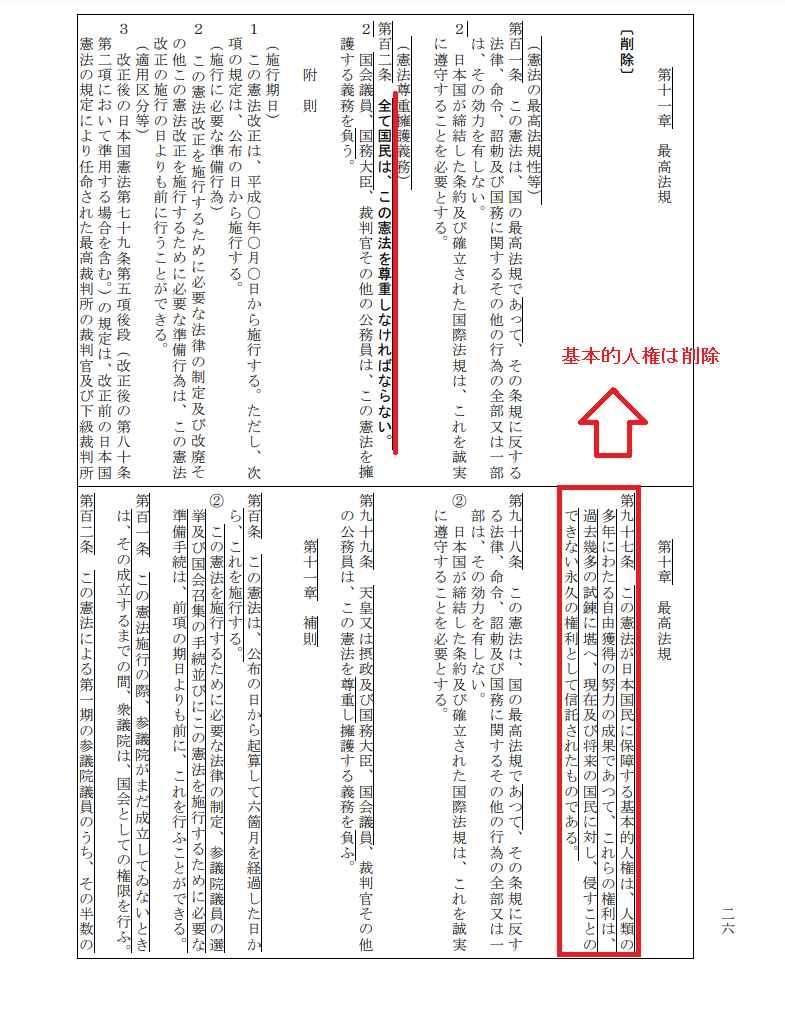 近代的な意味での憲法の概念から逸脱したものを、憲法と言い張るのはやめろや。むしろ、憲法を廃止します、日本は無憲法国家です!と宣言する憲法廃止論の方が、まだ筋が通ってるわ。