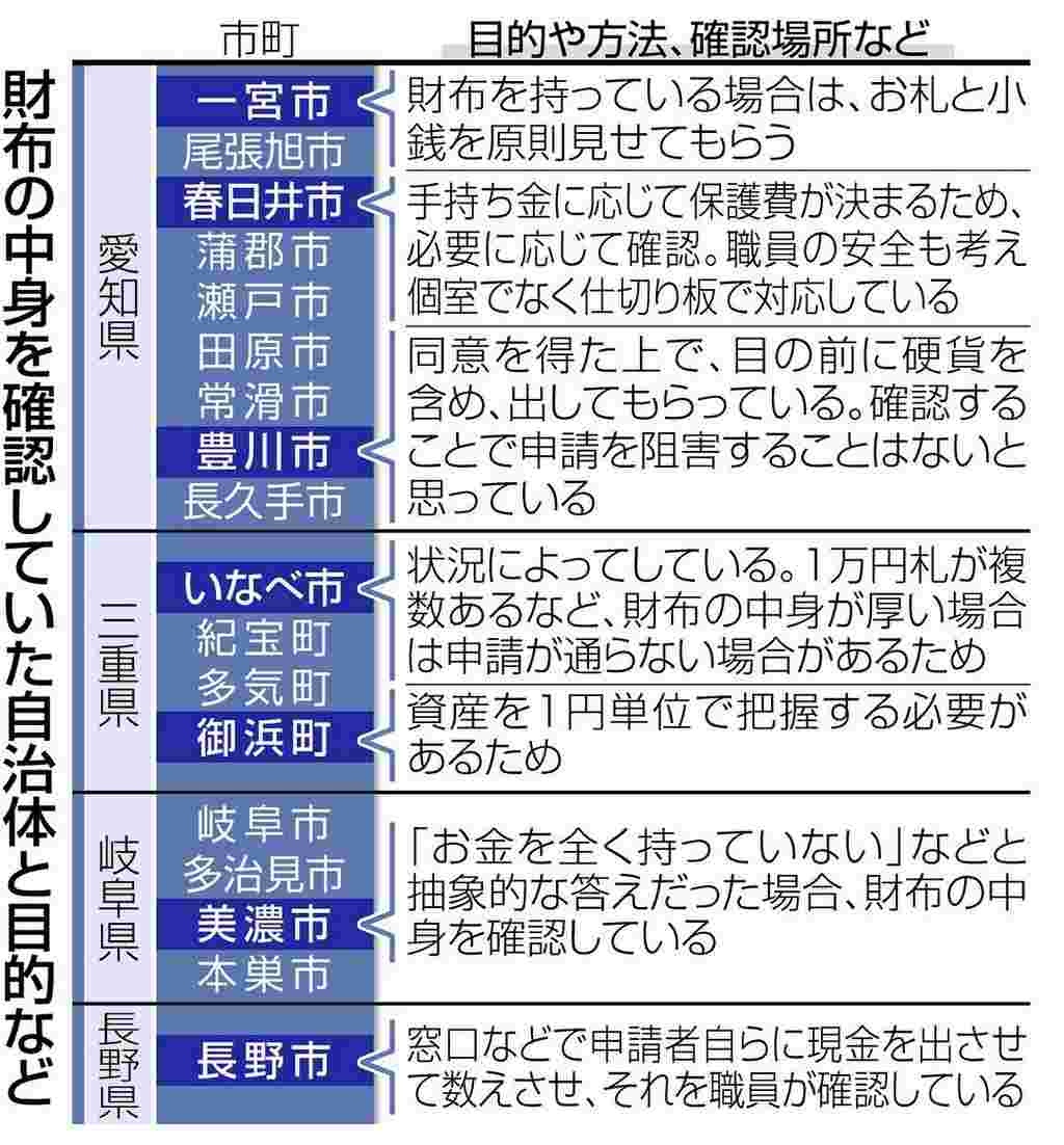これまでに本紙が報じた愛知、三重、長野各県の10市町と合わせ、中部地方の少なくとも計18市町が同様の手法で手持ち金を確認していた実態が明らかになった。本紙は1日から愛知、岐阜、三重、長野、福井、滋賀、静岡の7県の主な市町に「財布の中身を確認しているか」「過去にしていたか」と質問。