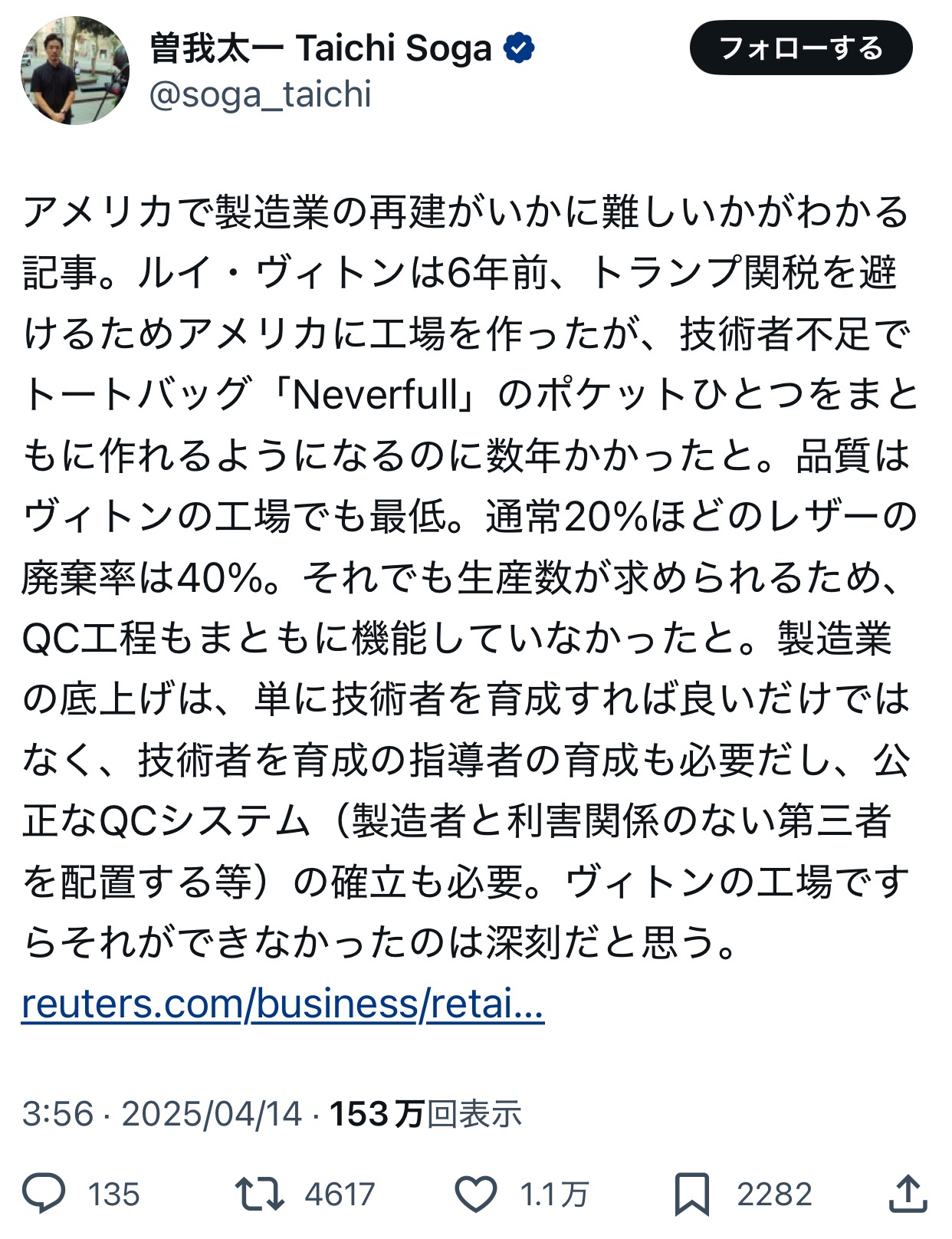 識者「アメリカの製造業再建はガチのマジで難しい ルイヴィトンですら技術者不足でバッグのポケット一つ作るのに数年掛かった」