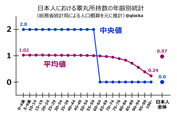 中央値は出生から還暦まで2個で、それを過ぎると0個に急減します。中央値で代表させた日本人全体の睾丸所持数はゼロです - 3 : 2022/04/17(日) 18:10:34.56 ID:FgNwVuAHa