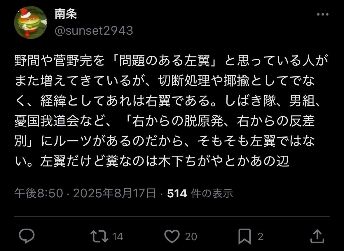 野間や菅野完を「問題のある左翼」と思っている人がまた増えてきているが、切断処理や揶揄としてでなく、経緯としてあれは右翼である。しばき隊、男組、憂国我道会など、「右からの脱原発、右からの反差別」にルーツがあるのだから、そもそも左翼ではない。左翼だけど糞なのは木下ちがやとかあの辺