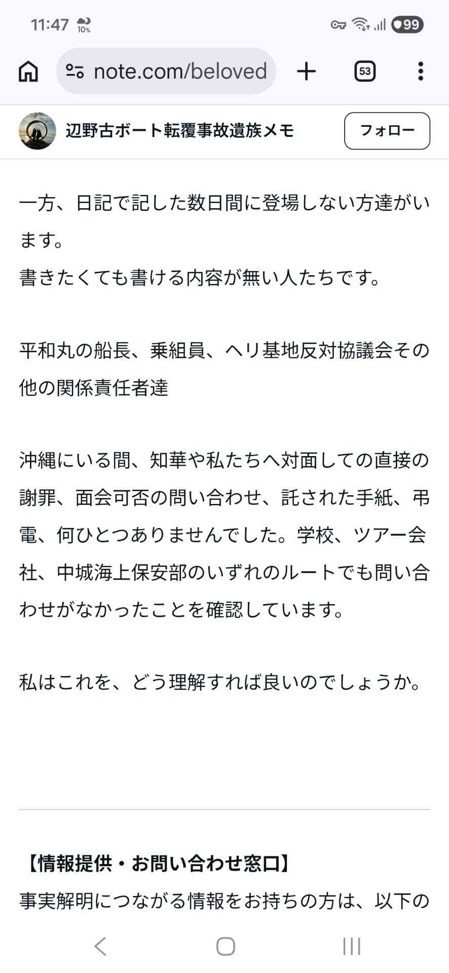 沖縄にいる間、知華や私たちへ対面しての直接の謝罪、面会可否の問い合わせ、託された手紙、弔電、何ひとつありませんでした。学校、ツアー会社、中城海上保安部のいずれのルートでも問い合わせがなかったことを確認しています。