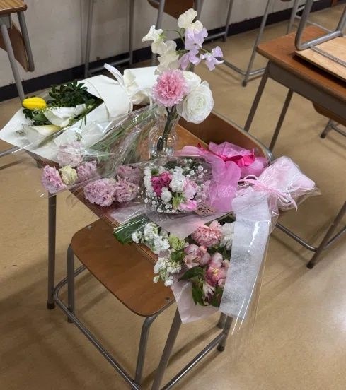 学校に届けられた弔電と献花