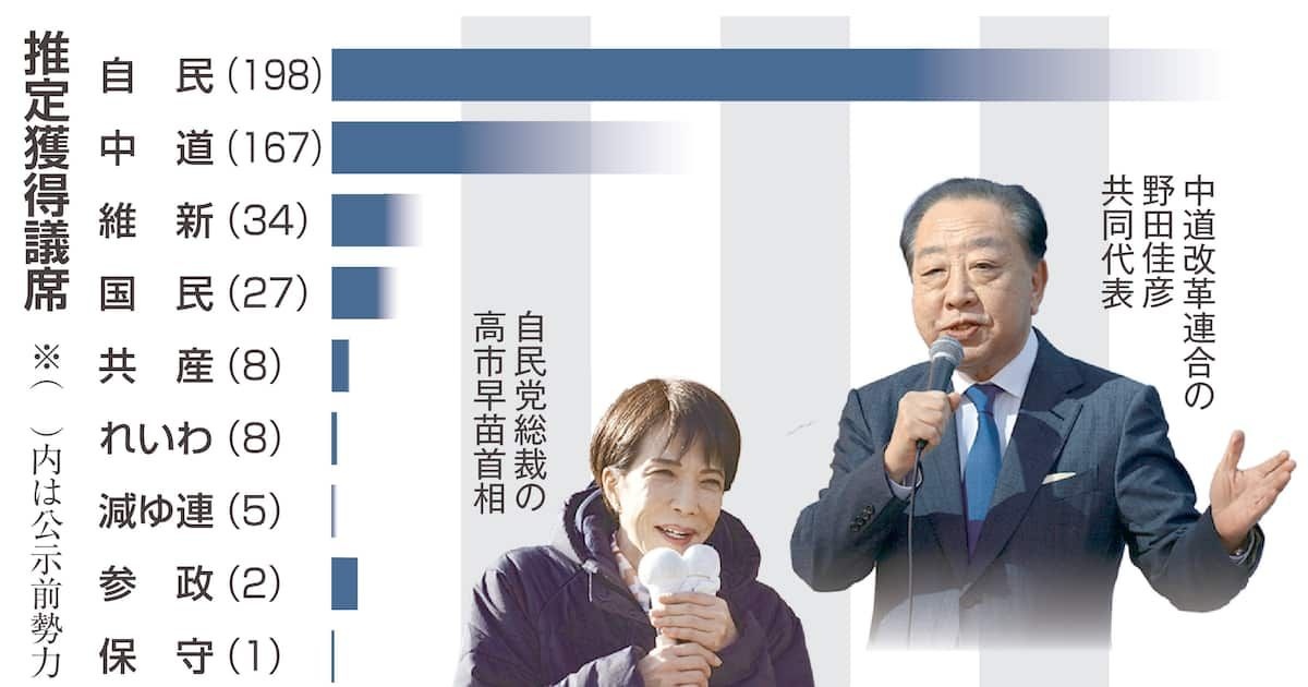 産経新聞社とFNNが実施した衆院選の情勢調査で、中道改革連合は小選挙区と比例代表いずれも伸び悩み、公示前議席(167)からの半減が現実味を帯びている。国政選挙…