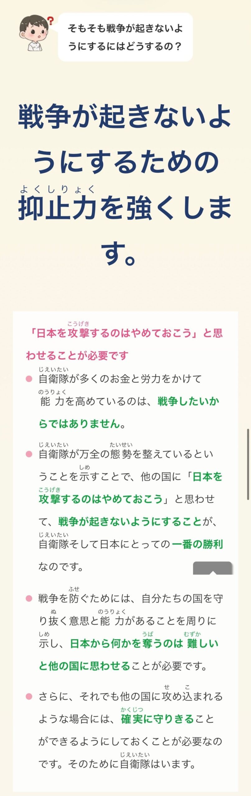さらに、それでも他の国に攻め込まれるような場合には、確実に守りきることができるようにしておくことが必要なのです。そのために自衛隊はいます。