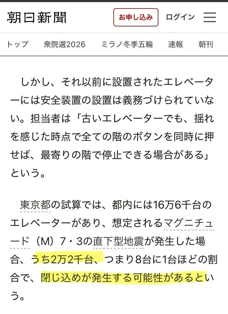 東京都の試算で、首都直下地震時「東京だけで2万台、15000人」がエレベーターに閉じ込められます。