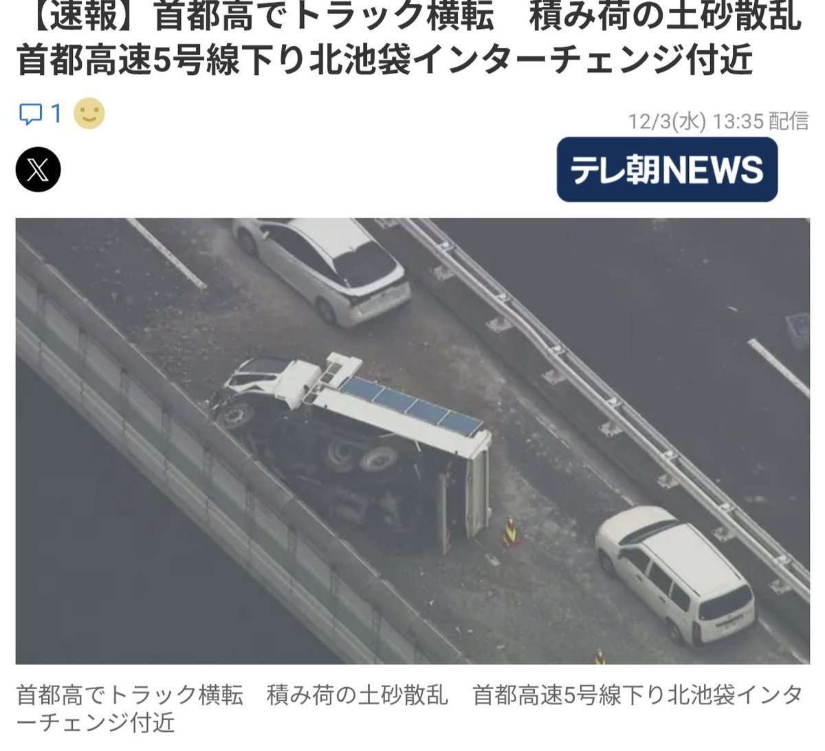 https://news.yahoo.co.jp/articles/fc5a1040cbd1a7c7acf06f940bce1d8bf25f4e8d首都高速でトラックが横転する事故があり、積んでいた土砂が道路上に散乱しました。