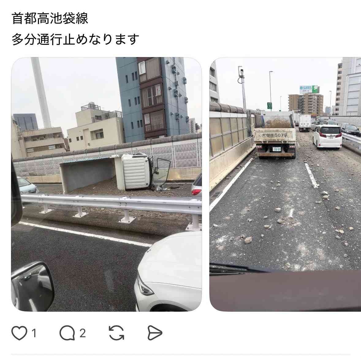 正午すぎ、東京・豊島区の首都高速5号線下り北池袋インターチェンジ付近で、男性から「トラックが横転している」と110番通報がありました。