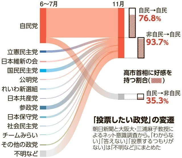 いま選挙があるとしたらどの政党に投票したいかという質問に、自民党と答えた人がこの半年で4割増と大きく伸びたことが、朝日新聞が大阪大の三浦麻子教授(社会心理学)と共同で実施したネット意識調査でわかった。