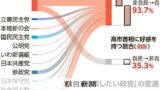 立憲民主は14.3%から10.2%に急減。野党で最多ではあるものの、維新に迫られている。共産党は3.7%から3.0%、れいわ新選組は4.5%から3.5%だった。
