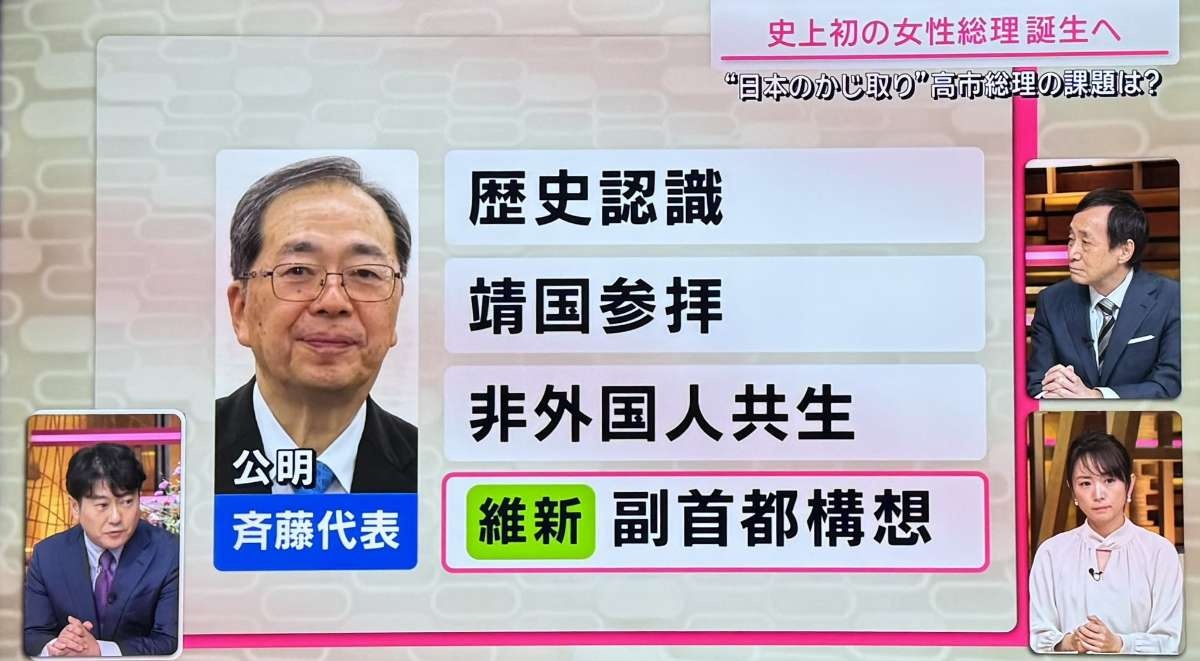 公明の斉藤代表は、自民の高市総裁との会談で、靖国神社参拝を含む歴史認識や外国人政策を巡り、認識を共有した点が多数あったと記者団に明らかにした。