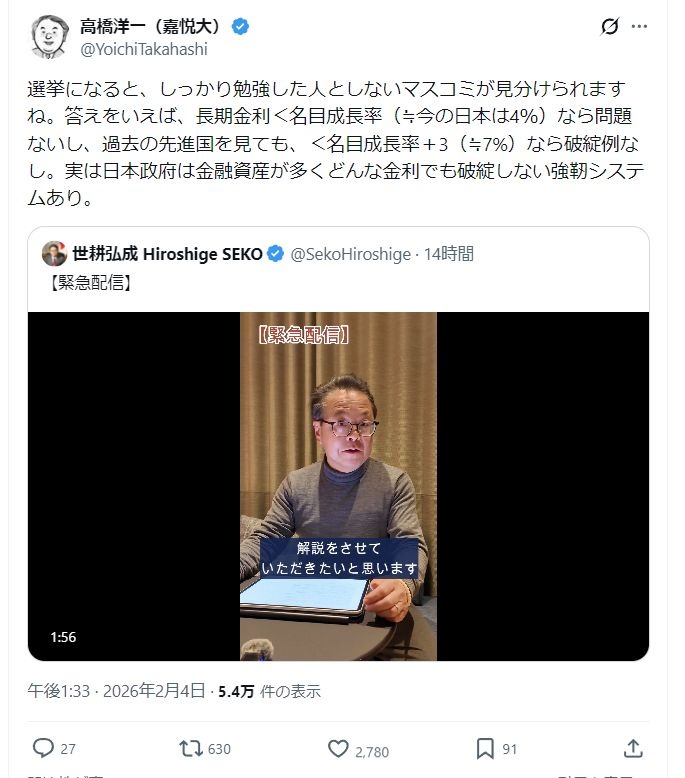 高橋洋一「長期金利<名目成長率(≒今の日本は4%)なら問題なし、日本政府は金融資産が多くどんな金利でも破綻しない
