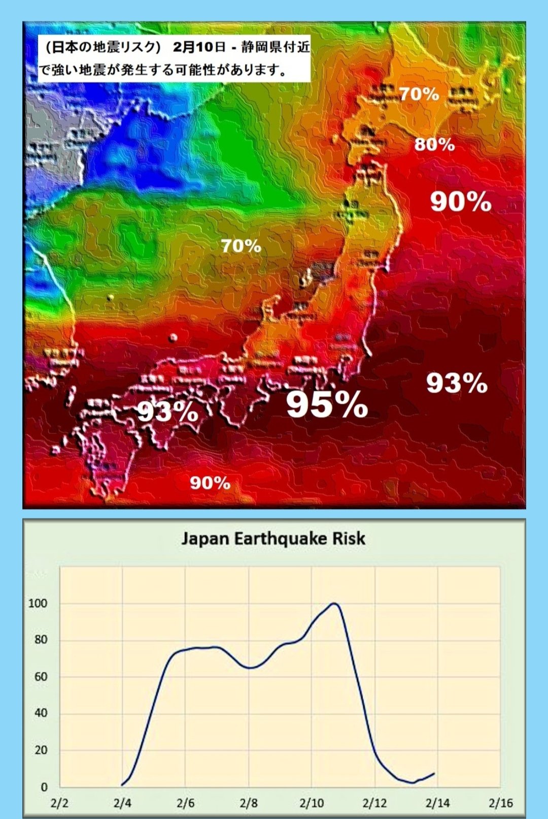 速報 アメリカの地震予測機関が「2月10日に静岡県付近で強い地震が発生する可能性がある。発生率95%」と予報したと流れている。地震予報は怪しまれやすいが、これまで50%近い的中率らしく、警戒することは悪くない。