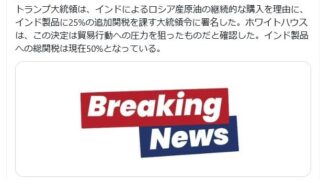 嫌儲 トランプ、インドのロシア原油購入の制裁としてインド製品に25%の追加関税へ