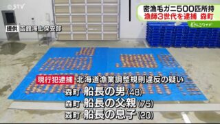 なんG 北海道で毛ガニの密猟、証拠品のカニをブルーシートに並べる
