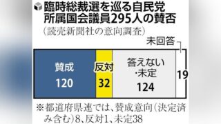 嫌儲 自民党臨時総裁選の実施「賛成」128、「反対」33…石破おろしに反対すると国民から嫌われるので賛成が増える。読売新聞調査