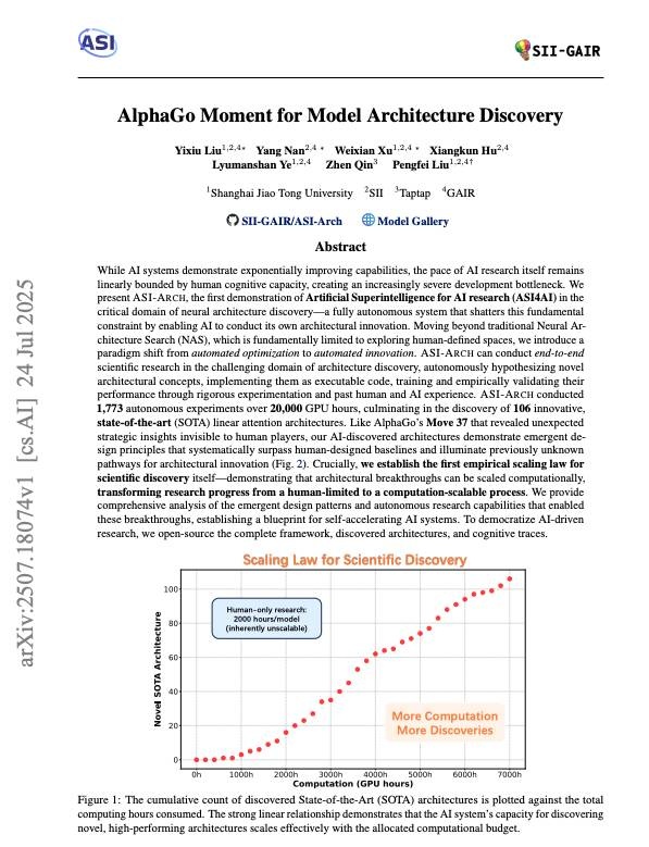 https://arxiv.org/pdf/2507.18074arxiv.orgAIの世界は最近、「AlphaGo Moment for Model Architecture Discovery」と題した論文によって興奮しました。この論文は、新しいニューラルネットワークアーキテクチャの発明、コーディング、検証が可能な完全に自律的なシステムであるASI-ARCHを導入しました。