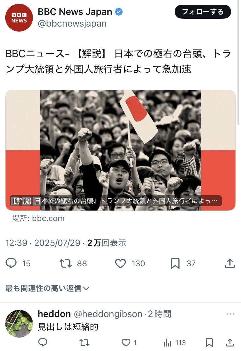 BBC「日本の極右化が急加速」→日本人ブチギレ