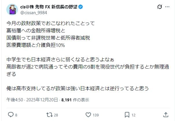こいつ最初は株価上がって高市信者だったけど超富裕層に課税から反高市に変わったよな。
