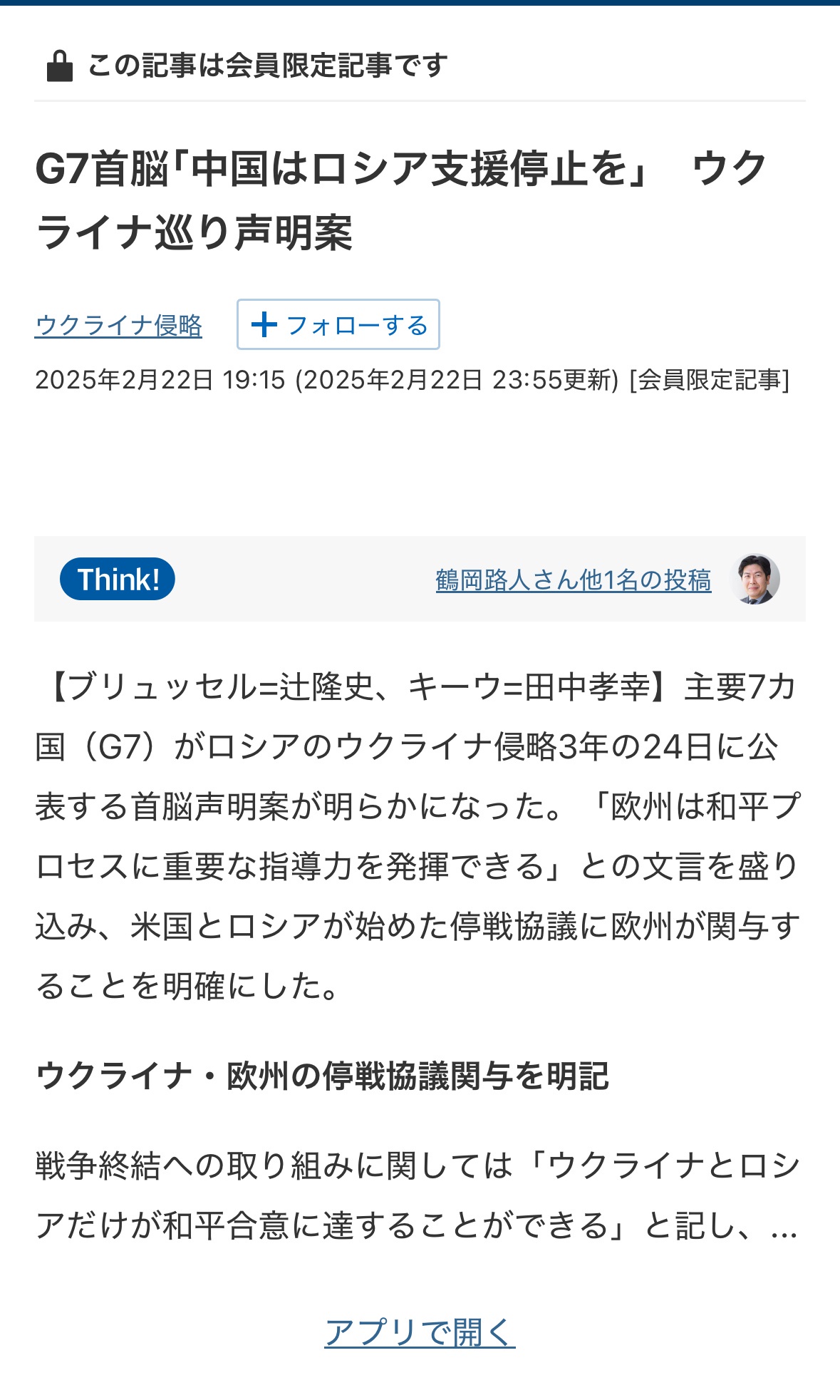 G7首脳共同声明「中国はロシア支援停止せよ」