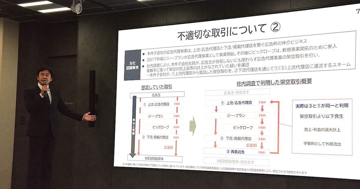 同社によると、子会社でインターネット接続事業のビッグローブと、関連会社でポイントサービスを手掛けるジー・プランの広告代理事業で、広告主が存在しない架空取引を繰り返し、売り上げを過大に計上していた。再委託先と発注元が同じで資金を還流させる手口で、松田社長は「取引高が雪だるま式に増え、月間数百億円が流れていた」と説明した。