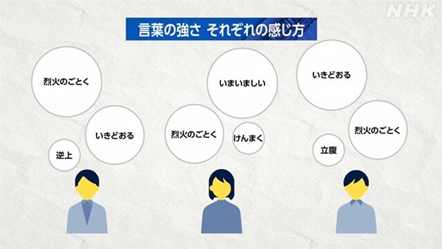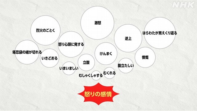 「怒り」の中にも多様な感情があり、ことばから感じる感情の強さが、人によって異なることを学んでいきます。