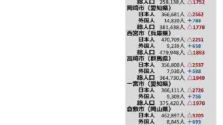 嫌儲 人口減少ヤバすぎる。政令市でも人口が増えたのは4つだけ。スーパーや居酒屋は潰れ電車バスの本数は激減するけどどうするよ