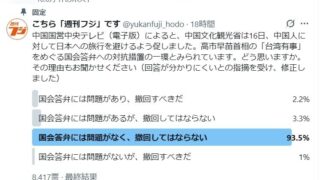 なんG 日本人の93.5%「高市発言は問題なし。野党や中国が悪い」www