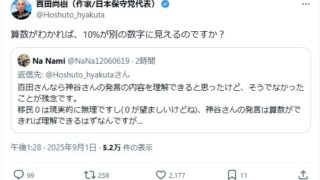 参政党支持者「神谷さんの発言は算数ができれば理解できるはず」百田尚樹「算数がわかれば、10%が別の数字に見えるのですか?」