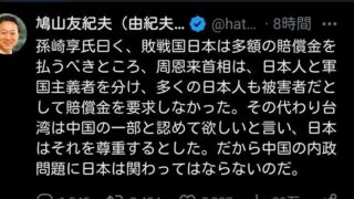 嫌儲 鳩山由紀夫さん「敗戦国日本は中国から台湾に口出ししない代わりに賠償金を免除してもらった。だから台湾問題に関わってはいけないのだ」