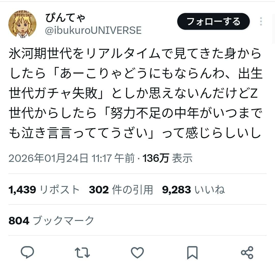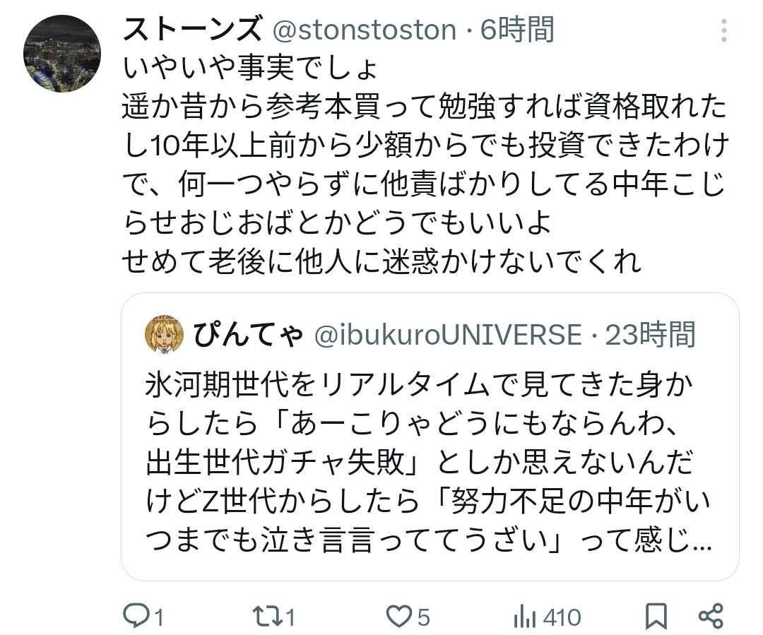 氷河期だけだよ、いつまでもウジウジと他責思考で国が悪い、自民が悪いとか言ってるの
