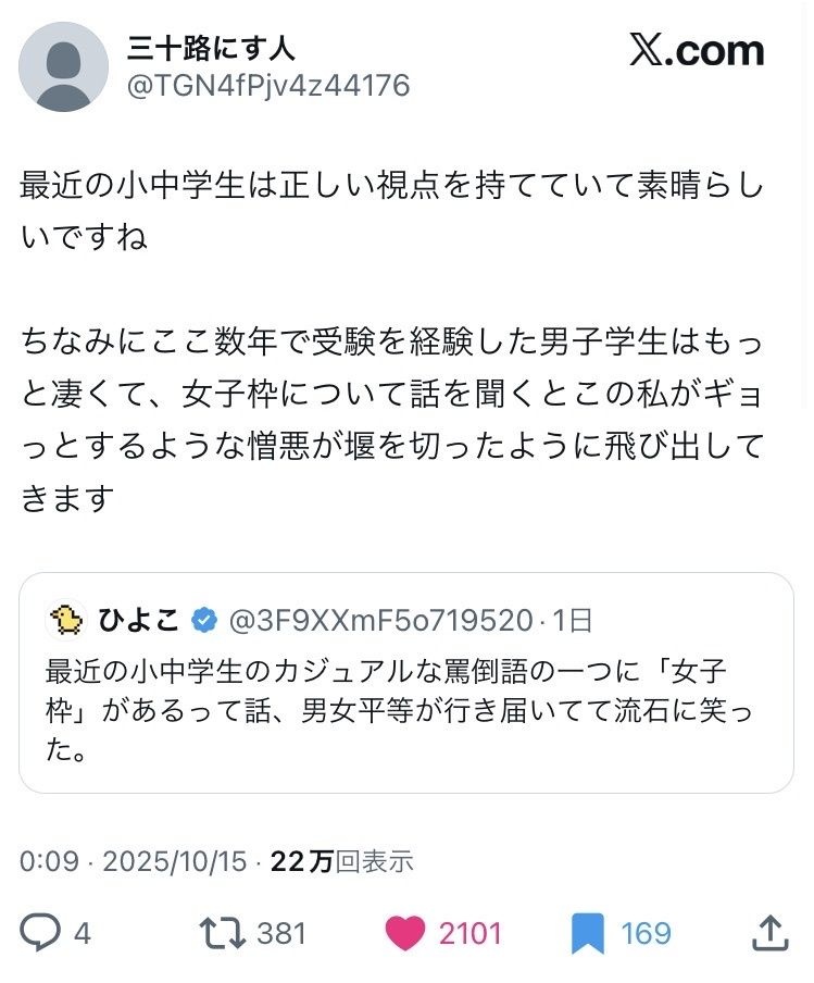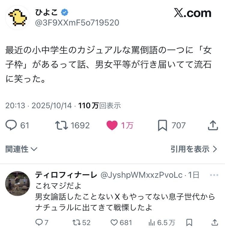 女子枠が笑えないのは良かれってやった制度なのに返って女性の技能や能力を低下させていて、社会人になって全く使い物にならんのよな