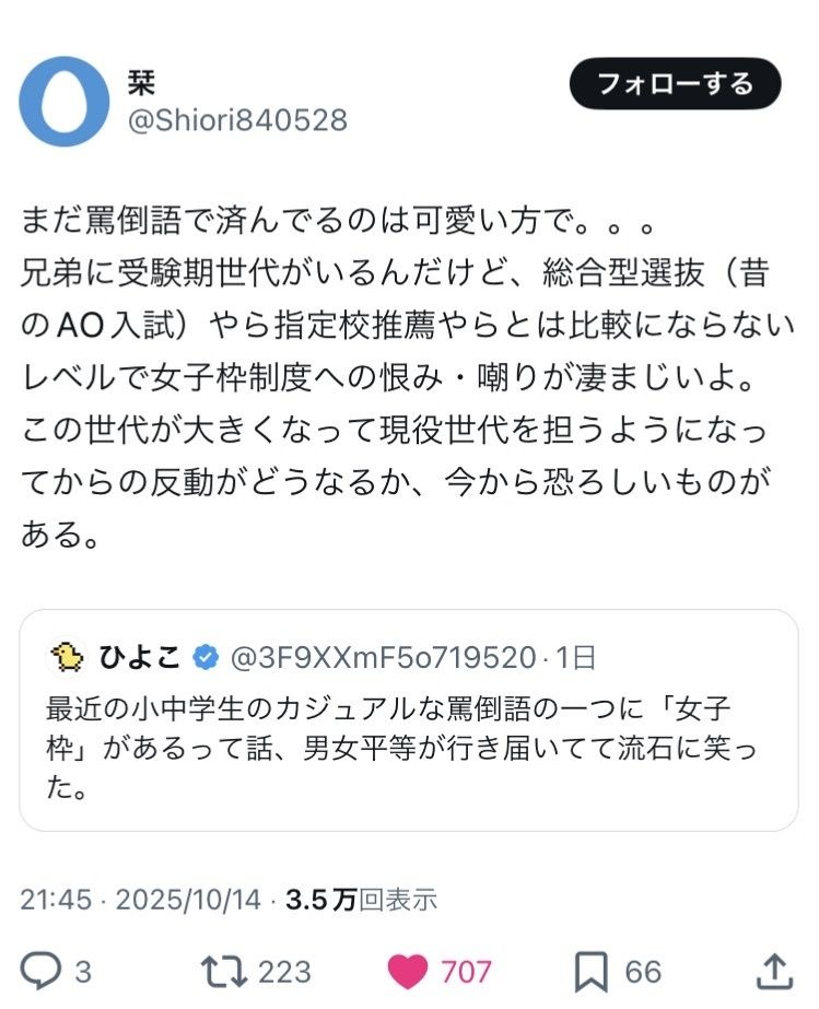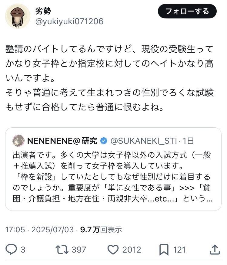 そもそも女子枠が気に入らないならそんなことやる大学には行かなければええだけやん